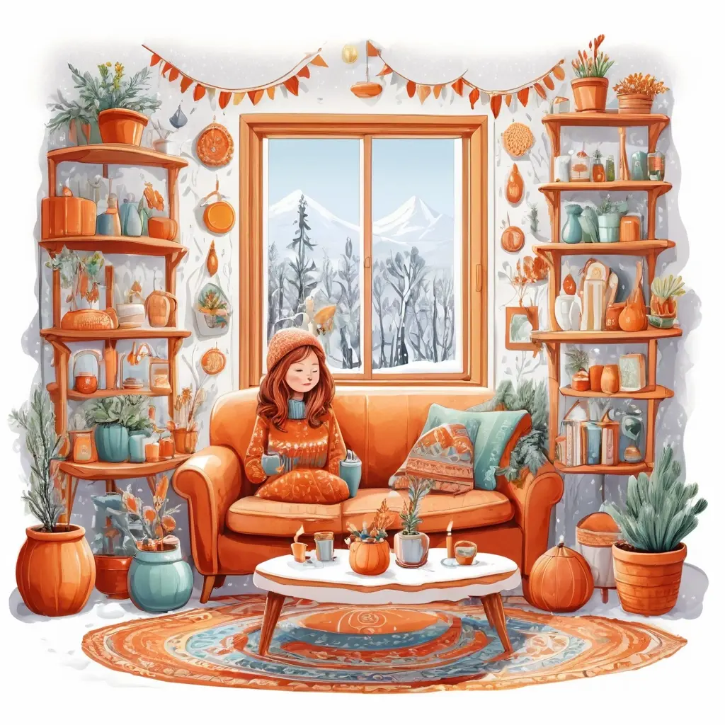 - Текстиль как тепло: добавьте плотные занавеси, пледы и большой ковер на пол. Минимум 2–3 слоя текстиля в зоне отдыха.